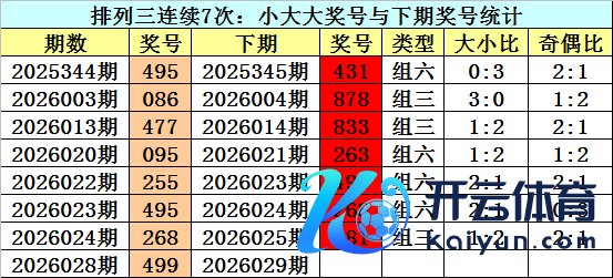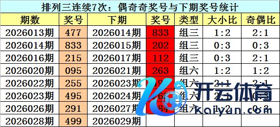 上期回归:成列三2026028期奖号为:499。类型:组三,奇偶:偶奇奇,大小:小大大。 奖号类型判断:近7次偶奇奇与小大掀开出之后,下期组三出现6次,组六出现8次,其中组三彰着活跃,本期防组三再出。另外,重号开出比例较高,本期防再出,参考号码9。 奇偶判断:上期成列三奖号为499,奇偶为:偶奇奇,近7次出现奇偶:偶奇奇奖号分裂为:477-833-215-095-255-495-291。 其下期分裂开出奖号:833-202-112-263-495-268-084。 其中奖号奇偶比为7:14,偶