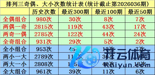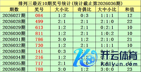 上期总结:罗列三第2026036期奖号为:788。奖号类型:组三体育集锦,和值:23,奇偶比:1:2,跨度:1,大小比:3:0。 大中小分析:在组选0-9号码分散图中,前10期小 号(0-2区段)出现10枚奖号,中号(3-6区段)出现8枚奖号,大号(7-9区段)出现12枚奖号,上期奖号皆在大号区域,本期看好中号码走冷,防御3-6区段不落号。 大小、奇偶分析:在贯穿40期奖号中,两大一小出现13期,现时遗漏1期、全大出现5期,现时遗漏0期、全小出现5期,现时遗漏3期、两小一大出现17期,现时遗漏