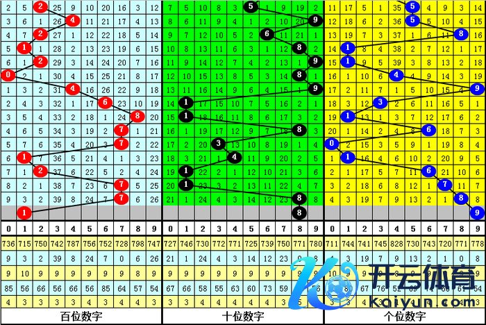 大中小分析:在组选0-9号码分散图中,前10期小 号(0-2区段)出现10枚奖号,中号(3-6区段)出现8枚奖号,大号(7-9区段)出现12枚奖号,上期奖号皆在大号区域,本期看好中号码走冷,防御3-6区段不落号。