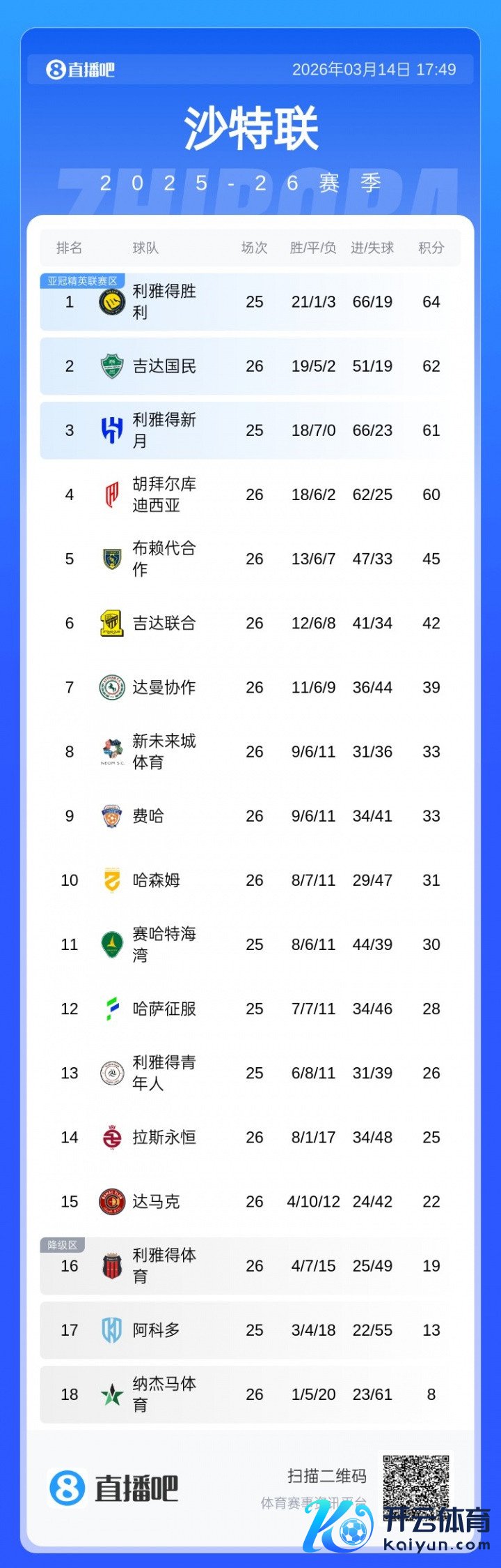 直播吧03月14日讯沙特联第26轮,吉达鸠集客场1-3负于利雅多礼育,近5轮仅拿到1胜2平2负,排行跌至沙特联第6。