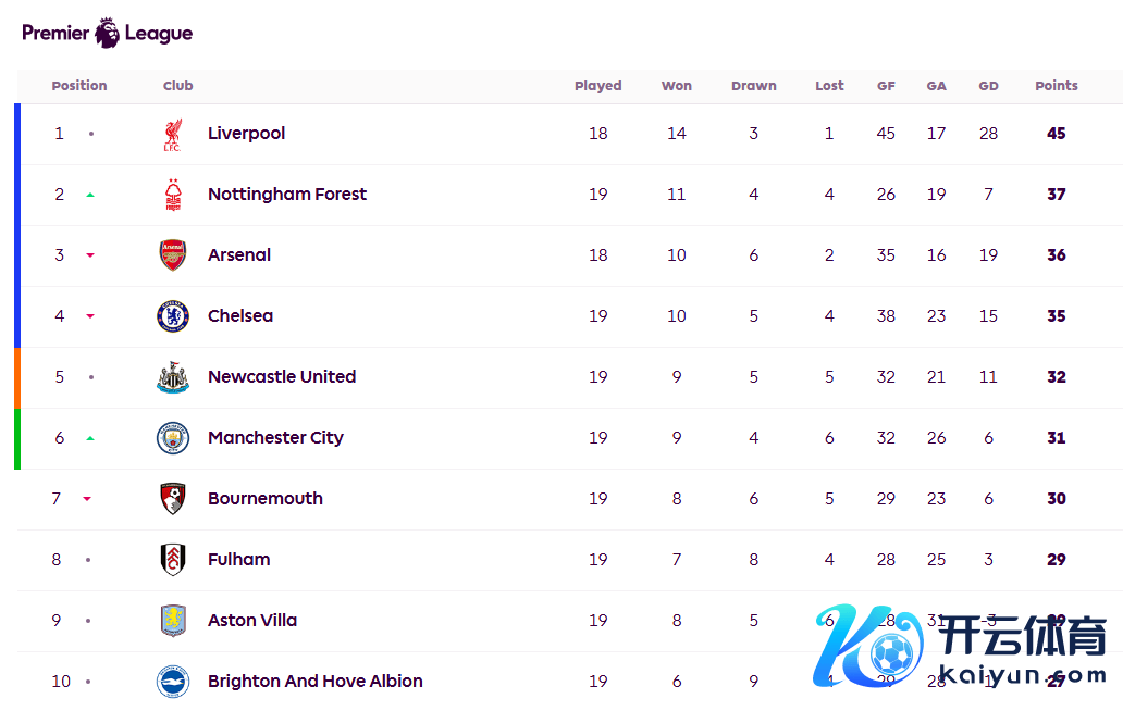 北京时辰12月31日讯息,2024-25赛季英超第19轮,曼联0-2不敌纽卡,各赛事碰到四连败,切尔西0-2送伊普斯维奇主场首胜,蓝军则碰到两连败。 现在的英超积分榜,利物浦少赛一场8分领跑,诺丁汉丛林暂时排在第二位,阿森纳和切尔西分列三四位。纽卡斯尔在拿下曼联后排在积分榜第五位,曼城升至第六位,热刺排在第11位,曼联依旧排在第14位。