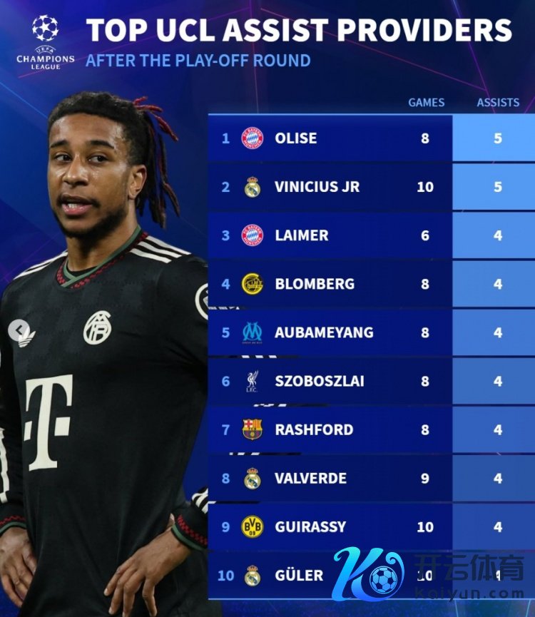 2月26日讯 欧冠淘汰赛附加赛也曾完赛,《转会阛阓》也统计了本赛季欧冠助攻榜,奥利塞、维尼修斯各5次。