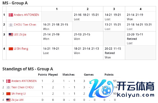 在男单A组第三轮中,李诗沣与马来西亚选手李梓嘉的比赛,共进行了40分钟。首局,李诗沣20-22先丢一局,而第二局,李诗沣11-15过期时,李梓嘉因伤退赛。而后李梓嘉之前2场比赛成绩取消。李诗沣成绩定格在1胜1负。但由于周天成2-1投诚安东森,效果,李诗沣名次小组第三,未能出线。在男单B组第三轮中,2号种子石宇奇用时30分钟,连丢两局,以0-2(14-21/17-21)不敌4号种子、日本选手奈良冈功大,小组赛两胜一负顺利出线。