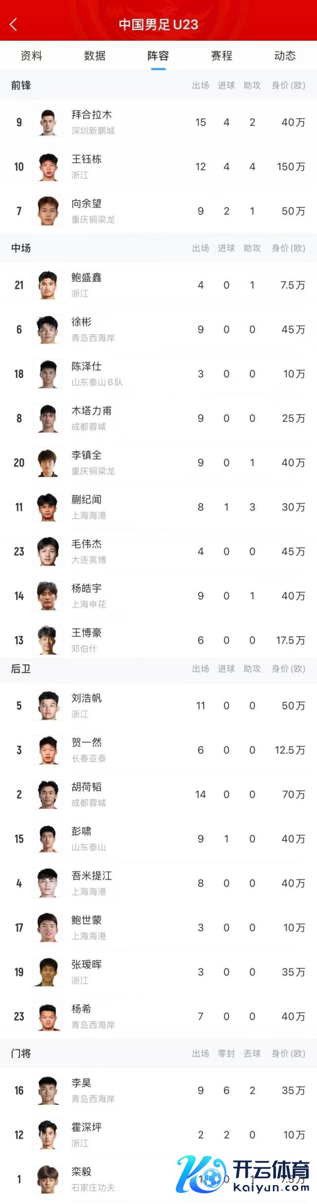 国足 U23 队内身价最高的球员是中超浙江队主力时尚王钰栋(150 万欧元),胡荷韬 70 万欧,向余望和刘浩帆 50 万欧,毛伟杰和徐彬 45 万欧,拜合拉木、吾米提江、杨希、杨皓宇、李镇全、彭啸 40 万欧,5 场悉数这个词赢得零封的李昊和张瑷晖 35 万欧。笃信本届 U23 亚洲杯事后,国足 U23 球员们的身价会大幅度普及体育最新信息,总之还得涨 ……