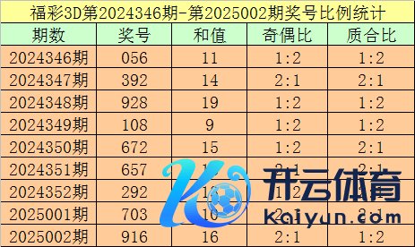 开奖归来:福彩3D第2025002期:奖号为916,奖号质合比为1:2,大小比为2:1,跨度为8,类型为组六。